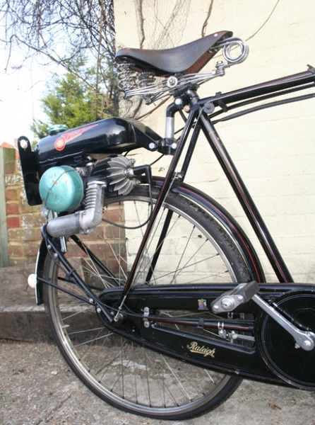 © Alle rechten voorbehouden Een minimotor Bj.1954 is gemonteerd op een fiets van`t merk Raleigh uit 1950