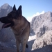 2 mannen en 2 honden beklimmen de bergen in de Dolomieten in het Rosengartenmassief.