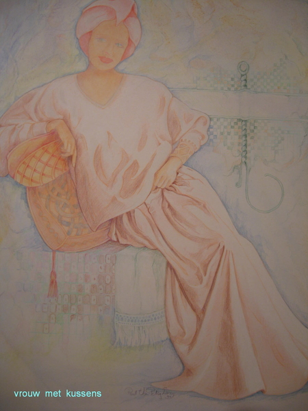 vrouw met kussens (pasteltekening)